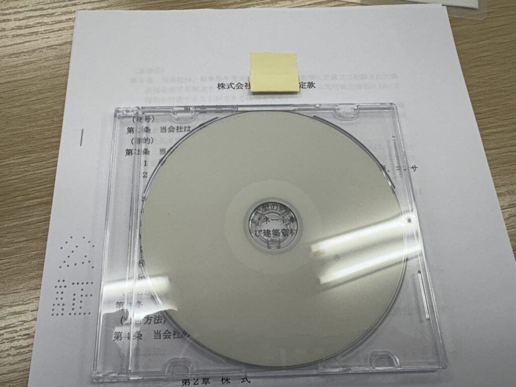認証が完了すると、電子定款の認証済みデータをいただけます。今回認証いただいた公証役場からはCDでいただきました。このデータを印刷して、紙の定款としても活用できます。
